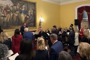 On Wednesday, I turned my full attention to our annual Carols in the Capitol event, which we have been blessed to present for nearly 10 years, with only a break during the COVID pandemic. This year’s concert featured a brass ensemble, keyboard, and LU Praise—a wonderful choir from Liberty University. About 150 people filled the Petinaud Room on the first floor of the Capitol and lifted their voices together in carols. I had the privilege of conducting the evening and singing three selections.